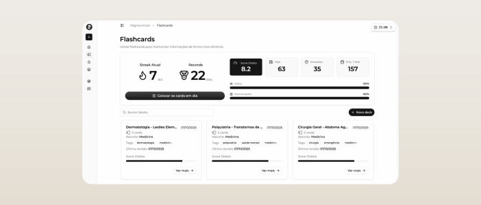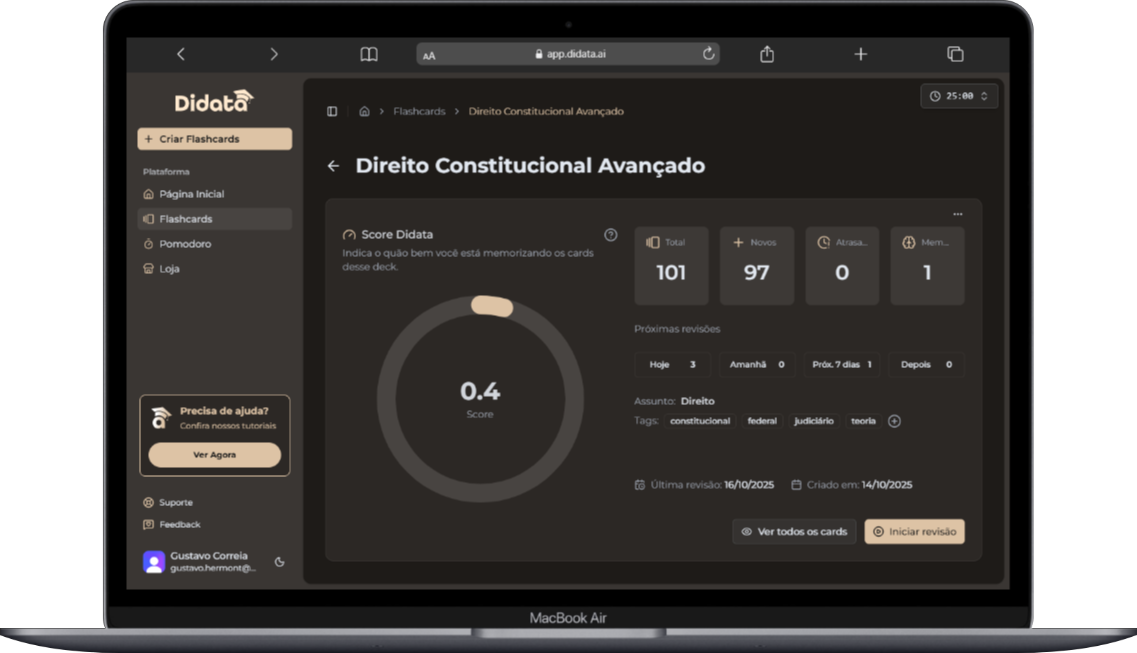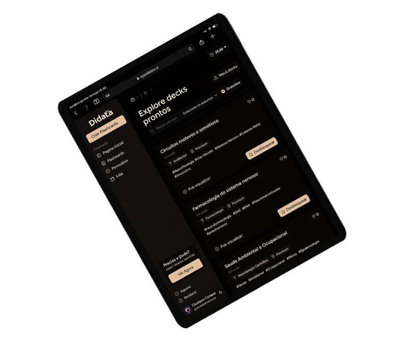 Métricas completas de flashcards e sessões Pomodoro para você saber exatamente como está evoluindo. Tenha acesso ao Score Didata, nossa métrica exclusiva que mede sua capacidade real de recuperar conhecimento quando mais importa.