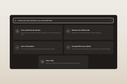Envie qualquer PDF, vídeo ou áudio e nossa IA transforma em flashcards prontos para memorizar. Edite, organize por matéria e comece a estudar imediatamente.