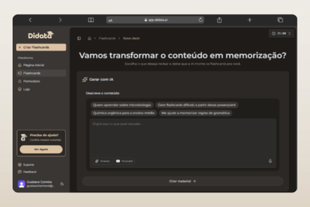Gere Flashcards com nossa I.A apenas falando um tema ou objetivo