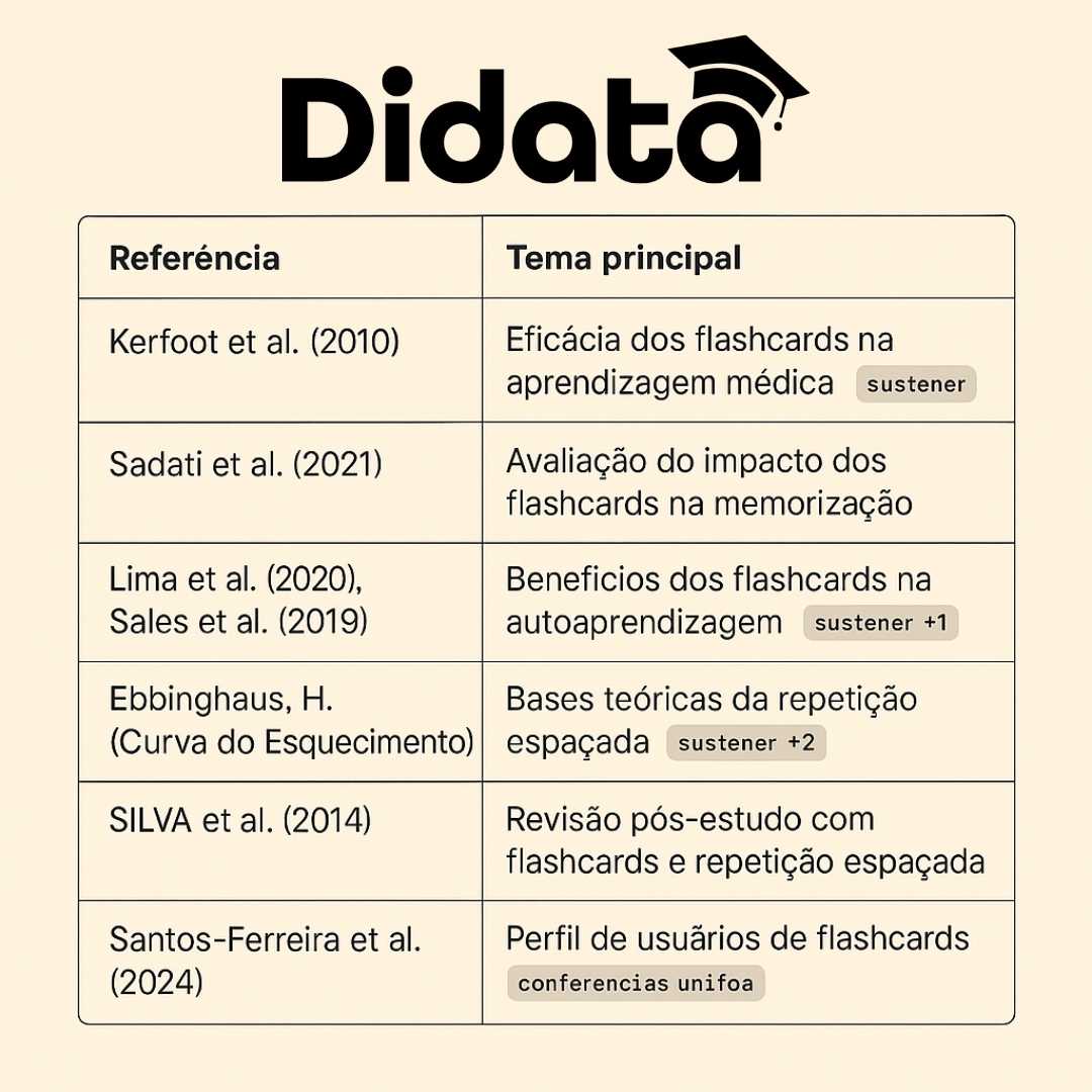 600+ estudos revisados por pares comprovando a eficácia da repetição espaçada nos estudos, 400+ publicações revisadas por pares apontando benefícios de Flashcards e Mapas Mentais na memorização e/ou aprendizagem.